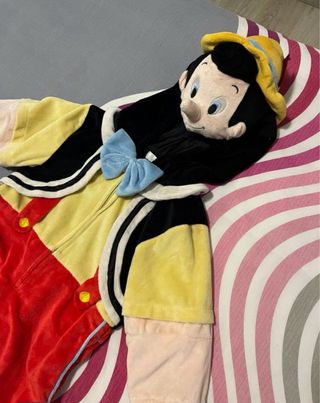 Disfraz completo del personaje de Pinocho, ideal para fiestas o eventos. - Incluye capucha con la cara del personaje. - Chaleco negro sobre camisa amarilla. - Pantalones largos en color beige. - Detalle de pajarita azul. - Talla 2-3 98cm