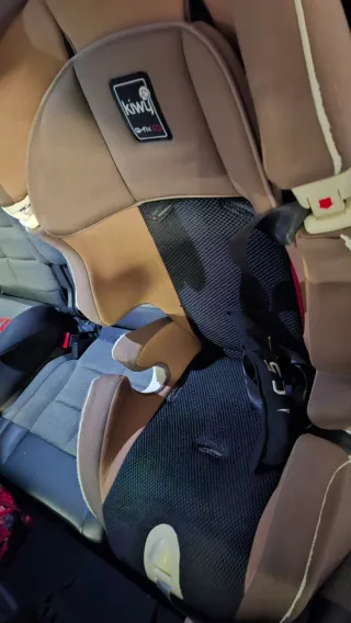 Silla de coche con sistema Isofix, perfecta como silla secundaria. - Color marrón y detalles en blanco. - Incluye cinturón de seguridad.