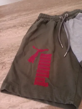 Conjunto deportivo Puma para niños de 9 a 10 años. - Pantalón corto de color verde con logo Puma en rojo. - Parte superior gris. - Cintura elástica con cordón ajustable.