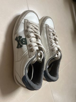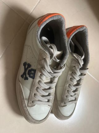 Zapatillas de niño de la marca Scalpers. Talla 34 (utilizadas en 2 ocasiones) - Diseño en color blanco y ante. - Detalle de calavera cruzada en los laterales. - Cierre con cordones. - Detalle naranja en el talón o detalle azul en el talón