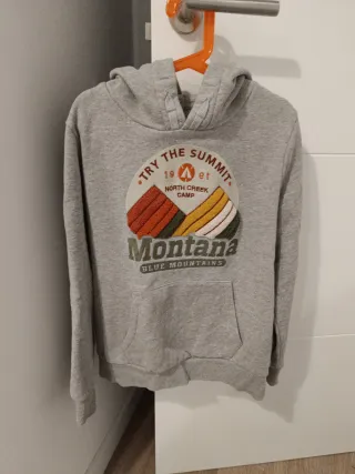 Sudadera gris con capucha para niño, talla 9/10 años. - Diseño con estampado Try the Summit y Montana Blue Mountains. - Bolsillo frontal tipo canguro. - Puños y bajo elásticos.