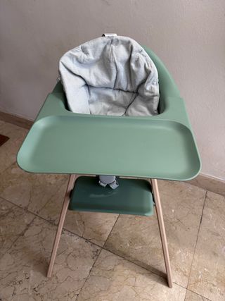 Trona Stokke Clikk en color verde, con cojín incluido. - Diseño moderno y funcional. - Bandeja de comida. - Cojín a rayas azules y blancas. - Usada muy poco. Estado como nuevo. - Tengo todavía la caja original.