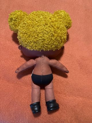 Peluche de la popular muñeca LOL Surprise. - Pelo amarillo rizado. - Ojos grandes y expresivos. - Ropa interior negra. - Zapatos negros incluidos. - No incluye ropa.