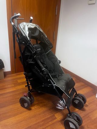 Cochecito de bebé McLaren Techno XT en color negro y plateado. - Diseño ligero y plegable. - Capota extensible. - Ruedas delanteras giratorias.