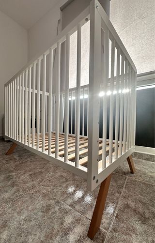 Cuna de bebé blanca con patas de madera