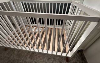 Cuna de bebé en color blanco, con un diseño moderno y funcional. Perfecta para el descanso del bebé, marca tama Precio en tienda 420€ - Ruedas para facilitar su movilidad. - Laterales de barrotes.