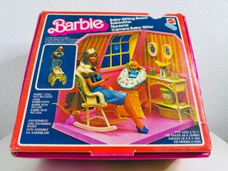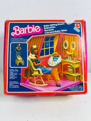 Set de juego Barbie Baby-Sitting Room de Mattel, lanzado en 1987. La caja muestra una escena de la habitación de la niñera con Barbie y un bebé. - Incluye accesorios como una báscula, frascos y una bañera. - La muñeca Barbie no está incluida. - Requiere ensamblaje. - Apto para edades de 4 a 11 años. habitación de la niñera de Barbie, lanzado por Mattel en 1977