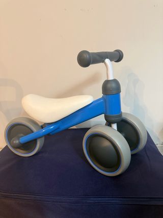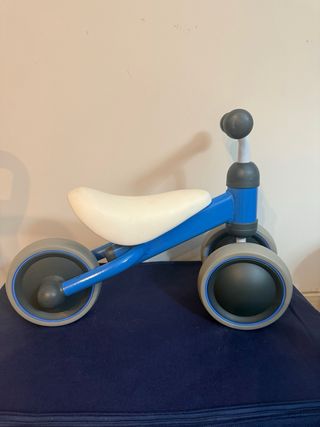 Correpasillos infantil de tres ruedas en color azul y blanco. Ideal para los primeros desplazamientos de los más pequeños. - Asiento blanco acolchado. - Manillar gris con puños. - Ruedas grises con detalles azules.