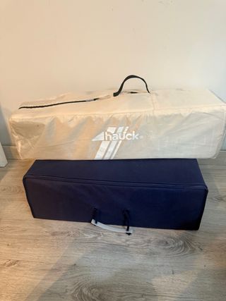 Se vende cuna portátil de la marca Hauck, ideal para viajes o para tener un espacio seguro para el bebé. - Incluye colchón. - Bolsa de transporte. - Color beige y azul marino.