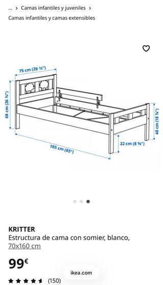 Estructura de cama infantil KRITTER de IKEA en color blanco. Incluye somier. - Medidas: 70x160 cm. - Diseño infantil con detalles decorativos en el cabecero.