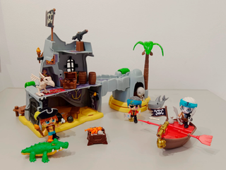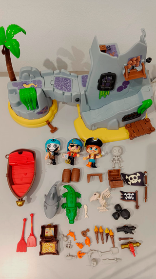 El Set se compone de dos cajas de Pinypon. La Isla Pirata del Capitán Caimán y el Bote Pirata. A parte se incluyen figuras extras sueltas. Faltan algunas pequeñas piezas como flechas y tiene algunas pequeñas marcas de uso pero en general en muy buen estado.