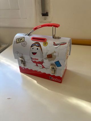 Hucha con diseño infantil de la marca Kinder, inspirada en viajes. - Forma de maleta. - Asa superior para transporte. - Cierre de seguridad. - Ranura para monedas.