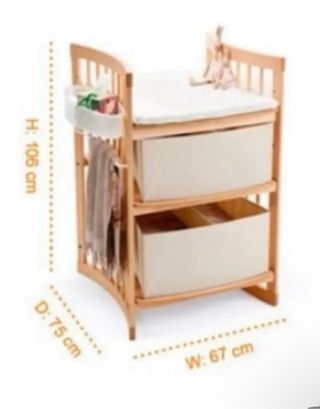 Cambiador de madera de haya con dos cestas de almacenamiento. - Estructura de madera de haya. - Dos cestas de tela beige. - Incluye cambiador acolchado. - Medidas: Alto 106 cm, Profundidad 75 cm, Ancho 67 cm.