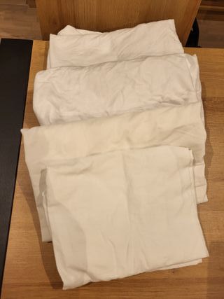Juego de cuatro sábanas bajeras de color blanco. Son suaves y cómodas. Dos de ellas son más gruesas para invierno (marca Coton Juice, El corte inglés) y las otras dos son más finitas para el verano (comprado en tienda local) - Material: Algodón. - Color: Blanco. - Precio unidad: 3€