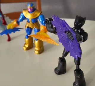 Colección de figuras de acción de superhéroes. - Figura de Batman con armadura azul. - Figura de Batman con traje de batalla rojo y amarillo. - Figura de Batman con armadura negra y roja metalizado. - Figura de El Lagarto con movimientos. - Figura de Spiderman con efectos de telaraña. - Figura de Thanos con guantelete doradoy ataques. - Figura de Black Panther con ataque morado. (Los juguetes son de mis hijos y el dinero será para ellos)
