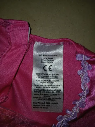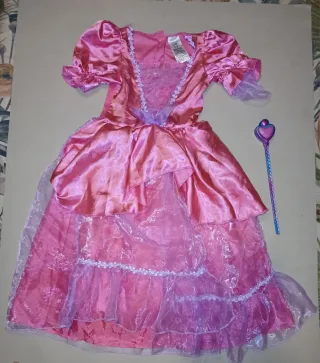 Precioso disfraz de princesa en color rosa, ideal para fiestas o juegos. - Vestido con mangas abullonadas y detalles de encaje. - Falda con varias capas de tela brillante y translúcida. - Incluye varita mágica a juego con corazón.