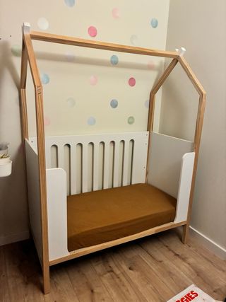 Cuna evolutiva de la marca Vertbaudet, modelo Coconut. Su diseño combina madera natural y blanco. Medidas: Prof. 74 x largo 128 x Al. 175 cm. Medidas colchon: 60x120cm. - Estructura de madera natural. - Lateral extraible - Colchón termoregulador con tratamiento de control de la humedaz - Somier ajustable en tres alturas diferentes. Vendemos porque no la ha usado, hemos pasado a cama grande directamente. Tiene algunos daños en la pintura del lateral extraible. (Ver fotos) Pvp actual cuna 295€ y colchon 90€