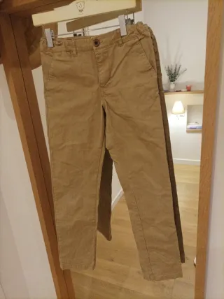 Pantalones de color marrón, estilo tejano. - Cintura elástica. - Cierre de botón y cremallera. - Bolsillos delanteros y traseros.