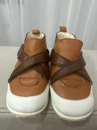 Zapatos tipo botita de la marca Blandy, ideales para un estilo barefoot. Perfectos para los más pequeños. - Talla 27. - Cierre con velcro. - Interior forrado de pelo. - Combinación de piel marrón y blanco.