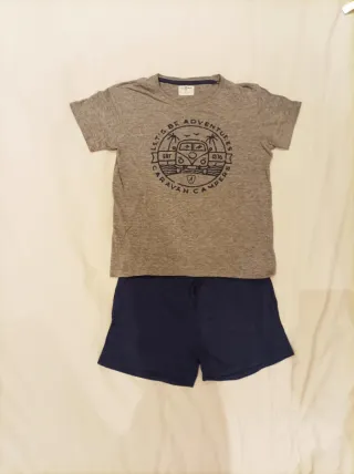 Conjunto de pijama corto con camiseta gris y pantalón azul marino. - Camiseta con estampado de furgoneta y texto Let's be adventures caravan campers. - Pantalón corto de color azul marino con cordón ajustable.