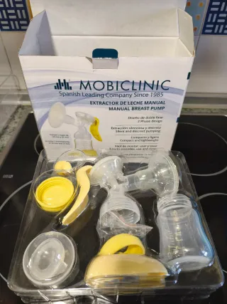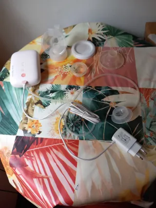 Sacaleches muy cómodo, con dos embudos de distintos tamaño.Con base para apoyar botes. Regulador para la intensidad de extracción. Dos botes con tapa, guantes, papeles y caja original. Esta muy bien cuidado y funciona perfectamente. Su precio original supera los 100 euros. Regalo dos paquetes de bolsas de leche valorados en 15 euros y una caja de biberones de cristal marca Avent valorados en 35 euros y un biberon Mam a estrenar.