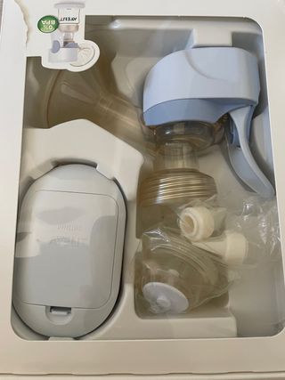 Sacaleches de la marca Avent Philips eléctrico y con las piezas necesarias, para hacerlo manual (foto 4, por si no hubiera toma de luz, poder seguir usándolo, a mí me vino bien para llevármelo al trabajo). Poco uso, ya que tuve que parar de lactar al poco tiempo, se esteriliza y tiene más vida! Tiene un cojín de latex suave que aporta comodidad y facilita el proceso de extracción estimulando tu producción de leche gracias a su diseño que imita el patrón de succión de tu peque. Regalo un bibe anticólicos y una gomita para sujetar la camiseta si no es de lactancia (foto 5) Pregúntame sin compromiso.