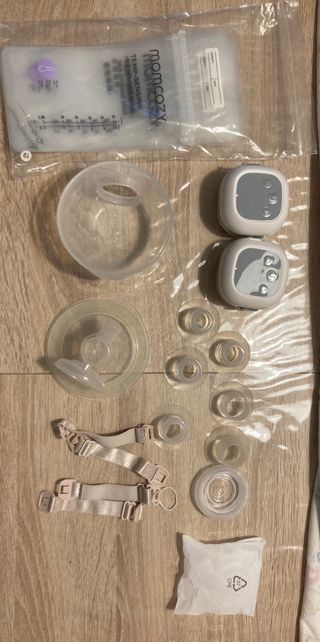 Sacaleches eléctrico doble de la marca Momcozy, modelo M5. - Incluye dos bombas. - Diseño portátil y discreto. - Fácil de usar y limpiar.