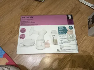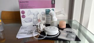 Sacaleches eléctrico Suavinex, ideal para la extracción de leche materna. - Incluye motor y todos los accesorios visibles en la imagen + biberón. - Diseño compacto y fácil de usar.