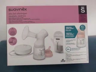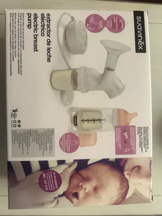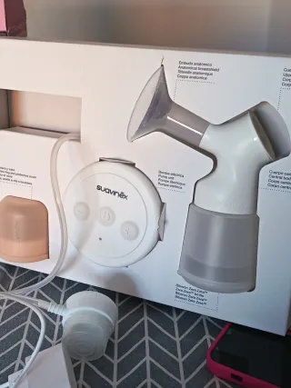 Sacaleches eléctrico de la marca Suavinex, diseñado para facilitar la extracción de leche. - Incluye manual de instrucciones en varios idiomas. - Componentes de plástico y silicona. - Usado solo 2 veces.