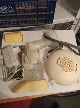 Sacaleches eléctrico MEDELA. Evidentemente está usado, pero bien cuidado. Es de las mejores compras que he echo! Va con instrucciones y varias cosas sin utilizar, como paquete de esterilizado para microondas, bolsas de almacenamiento de leche materna y dos paquetes de discos absorbentes. (No está abierto, porque utilizaba otras cosas que tenía yo aparte). Tiene su maquina con enchufe, dos tetinas adaptadas a diferentes tamaños de pecho y dos botes para extracción de leche de 130 y 250ml.
