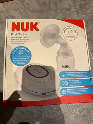 Sacaleches eléctrico NUK First Choice+. - 16 opciones individuales de ritmo y fuerza de succión. - Unidad de bombeo potente. - Función de memoria para el programa favorito de mamá. - Cojín de silicona suave. Se ha utilizado muy pocas veces por falta de subida de leche
