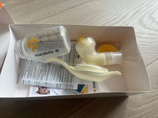 Sacaleches eléctrico marca Medela con biberón 125ml de Philips Avent.