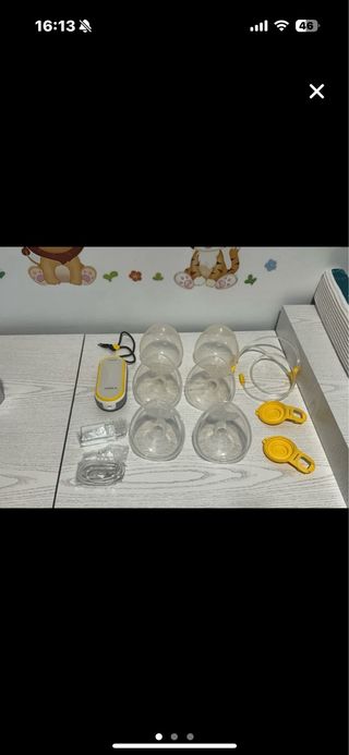 Sacaleches eléctrico y manual de la marca Medela, con todos los complementos como tres botellas de 150 ml, 2 botellas de 250 ml, 4 embudos, 4 copas para recoger la leche, bolsitas para congelar la leche, discos absorbentes, cargador, cable, jeringa, base para botellas, etc. Incluye pezoneras nuevas por si las necesita. Nuevo la mayor parte de los complemento y artículos son nuevos. El sacaleches eléctrico en buen estado.