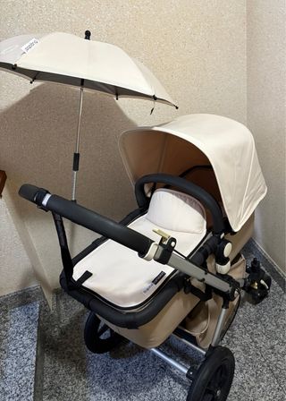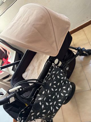 Carro de bebé Bugaboo con un diseño moderno y funcional. - Color rosa y beige. - Incluye capota. - Saco de invierno con estampado infantil.