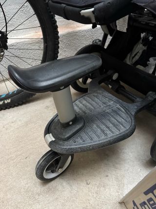 Silla de paseo Bugaboo Donkey en color negro. Diseñada para gemelos o hermanos con poca diferencia de edad. - Chasis negro. - Asientos reclinables. - Capota extensible. - Cesta de compras. - Barra de seguridad. - Reposapiés. - Ruedas todoterreno. - saco invierno y primavera - patinete para hermano