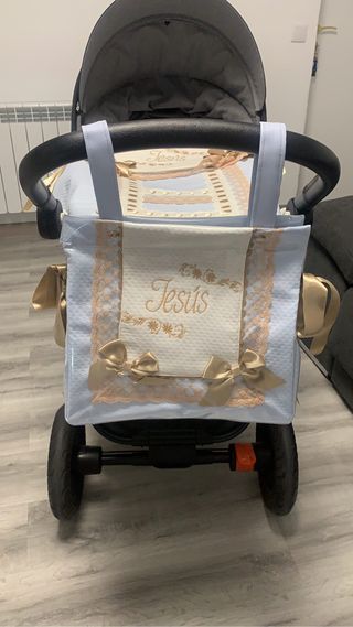 Se vende saco para capazo y bolso. Color azul y beis con detalles dorados. El nombre se puede quitar. En perfecto estado. Más información por privado.