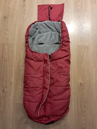 Saco de invierno universal para cochecito o sillita de bebé, ideal para mantener al pequeño abrigado en los días fríos. Muy práctico - Exterior en color burdeos. - Interior forrado en suave tejido gris. - Aberturas para el arnés de seguridad. - Capucha ajustable con cordón. Como nuevo