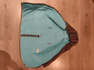 Saco de porteo ideal para mantener abrigado a tu bebé durante el invierno. Su diseño es cómodo y funcional. - Color azul claro. - Estampado de casitas blancas en la parte inferior. - Capucha incorporada. Usado solamente una vez, cuesta unos 40 euros. Oportunidad! Muy comodo y recomedable para el frio bebe