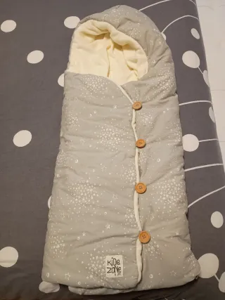 Saco de dormir para bebé, ideal para los meses más fríos del año. Está en muy buen estado y es perfecto para mantener a tu pequeño abrigado y cómodo. - Diseño con estampado de puntos grises y beige sobre fondo blanco. - Incluye capucha con orejitas. - Cierre con lazo en la parte inferior.