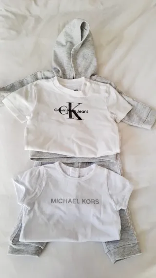 Conjunto de ropa para bebé de 0 a 3 meses. - Incluye sudadera con capucha Michael Kors - Pantalon Michael Kors - Camisetas blanca Michael Kors - Camiseta blanca Calvin Klein - Pijama Zara - Body y babero de Irlanda -Saco abrigo Beaba