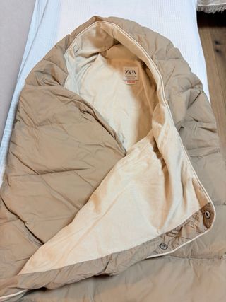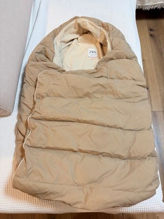 Saco de bebé de Zara, perfecto para mantener a tu pequeño abrigado. Es de color camel y tiene un forro interior beige.Lleva relleno de plumón súper ligero, no pesa nada y puede lavarse en lavadora. Se ha usado menos de 15 días. Está como nuevo y lo entrego limpio Costó 50 euros.