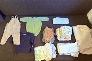 Lote de ropa de recien nacido y bebé hasta 6 meses o 70 cm. La mayoría con apenas dos puestas. Consta de 13 bodys de manga larga y corta 3 pijamas de manga larga y uno de manga corta Dos petos de punto 1 jersey Dos cubrepañales o pantalones con tirante 1 pantalón de punto De regalo un saco de dormir algo más usado pero en perfecto estado Marcas: Zara, tex, prenatal...