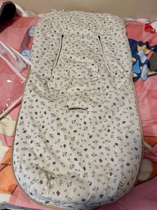 Saco de invierno para silla de paseo, en color beige con estampado. Está en buen estado. - Incluye un saco y una colchoneta. - Tejido suave y acolchado. - Perfecto para mantener a tu bebé calentito durante los paseos.