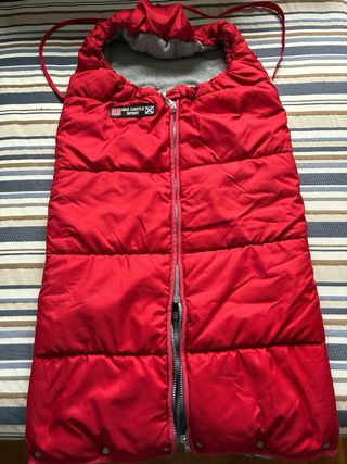 Saco de invierno para silla de paseo, compatible con Maxi-Cosi y Bugaboo. Color naranja con interior en rojo. - Diseño con capucha. - Cierre con cordones ajustables. - Logo de Maxi-Cosi visible. Entrega en mano en Tolosa o Gasteiz.