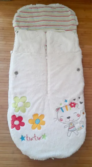 Saco de invierno para silla de paseo de la marca Tuc Tuc. Es muy suave y calentito. Esta en buen estado, tiene un pequeño desgarro en la parte trasera que no se aprecia. Usado en modelo Bugaboo Bee - Diseño con estampado de gatito y flores. - Forro interior de pelo. - A rayas en la parte superior.