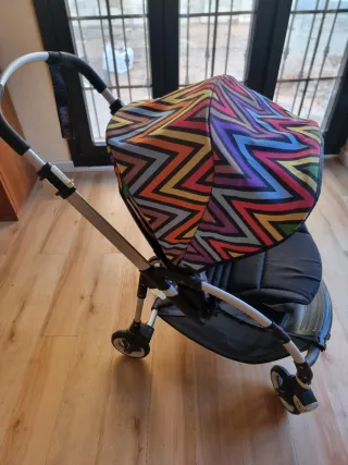 Silla de paseo Bugaboo Bee con un llamativo diseño Missoni. Incluye: Capota Lluvia Manta Missoni Patinete 1 saco azul 3 fundas Capota negra. Funciona todo correctamente - Capota con estampado zigzag multicolor. - Chasis plateado. - Ruedas negras.