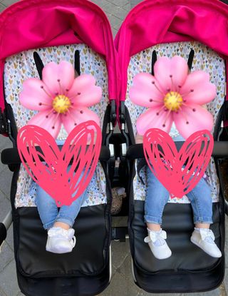 El artículo compone de dos piezas: la funda (lo que va en la base de la silla) y el saco (reversible). Tela estampada de corazones con interior waffle rosa palo. Puedes poner el saco (es como un mini-nórdico) o quitarlo y dejarlo únicamente con la funda de la silla. Confeccionado a medida para el bugaboo donkey. Me costaron 145€ cada uno. 290€ los dos. Vendo los dos por 120€. 60€ cada saco. No los vendo separados. Están como NUEVOS