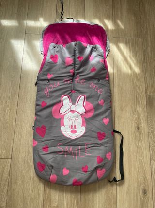 Saco para carrito de bebé con un adorable diseño de Minnie Mouse y corazones. - Estampado de Minnie Mouse con lazo rosa. - Fondo gris con corazones rosas. - Interior suave en color rosa. - Cierre de cremallera central. En la parte de detrás tiene unos cortes, porque la usaba en el bugaboo bee. Tiene un plástico dentro, que del uso del calzado está descandado. Por lo demás, está muy bien.