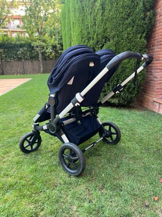 Cochecito doble Bugaboo Donkey 1 en color azul y negro. Ideal para hermanos. - Asiento reversible. - Capazo incluido. - Manillar ajustable. - Ruedas todoterreno. - 2 sillas con sacos para invierno. - 2 cucos. - 2 colchonetas de verano. - 2 capotas. - 1 plástico para lluvia (individual). - 2 sombrillas. - cesta lateral. - bolso para gemelar. - cesto inferior. - 1 "PARAPLIS" (para el paraguas de la mamá). - acople doble Maxi-Cosi