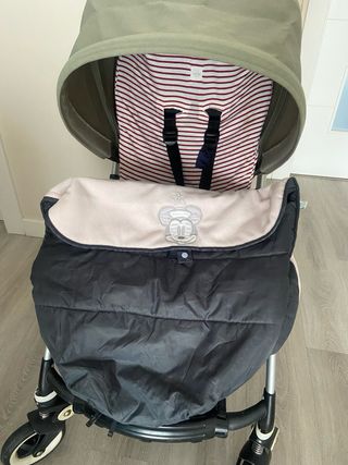 Bugaboo con capazo y silla negra. Accesorios bugaboo: 2 capotas negras de invierno, burbuja de lluvia, cesto, saco invierno bugaboo color rosa. Accesorios otras marcas: saco invierno animal print marine, colchoneta verano rayas azules y verdes, guantes invierno y protectores manillar.